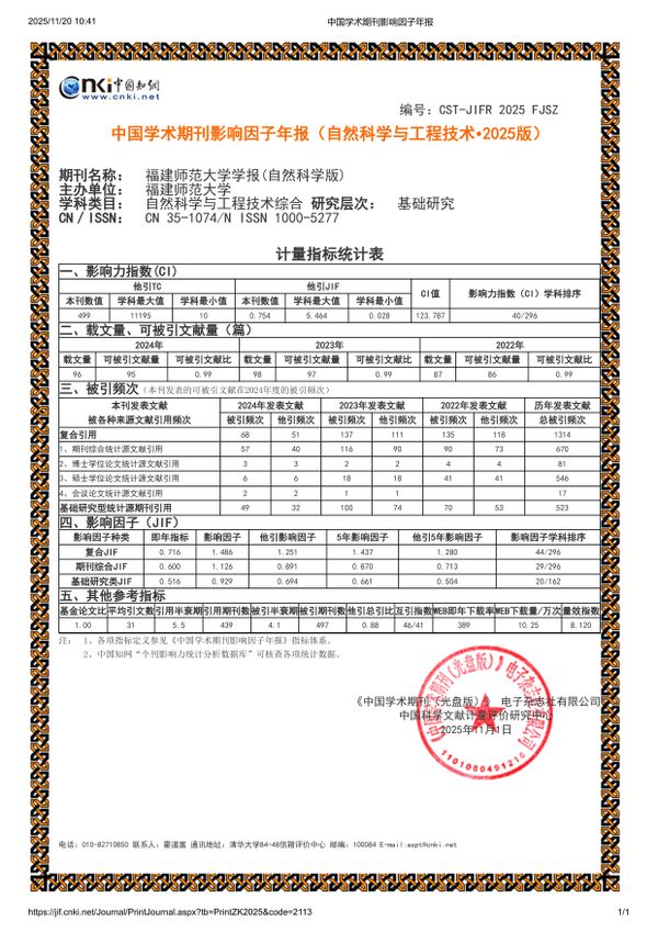 日前,《中国学术期刊(光盘版)》电子杂志社有限公司、中国科学文献计量评价研究中心联合发布《中国学术期刊影响因子年报(自然科学与工程技术• 2025版)》。数据显示,《福建师范大学学报(自然科学版)》学术影响力持续提升,连续8年位于Q1区,影响力指数CI值为123.787,期刊综合影响因子相较上一年提升45.10%,再创历史新高。在自然科学与工程技术综合类296种期刊中排名第40位,相比上一年前进18位,首次跃升至福建省首位。