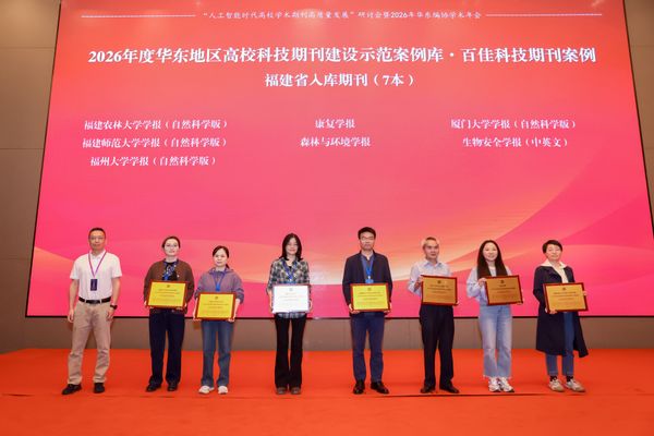 近日,“人工智能时代高校学术期刊高质量发展”研讨会暨2026年华东编协学术年会在江西省上饶市召开,会上发布了“2026年度华东地区高校科技期刊建设示范案例库”遴选结果。《福建师范大学学报(自然科学版)》入选“2026年度华东地区高校科技期刊建设示范案例库·百佳科技期刊”。